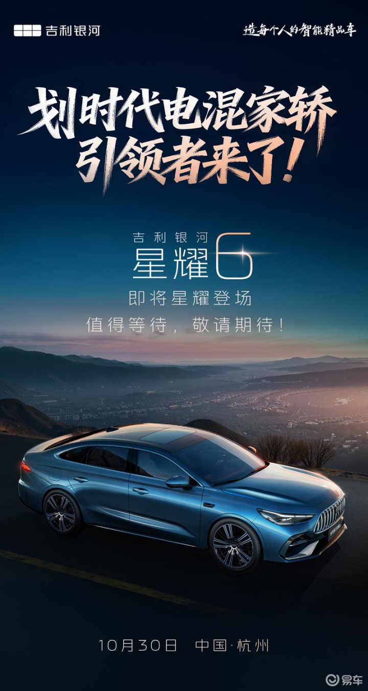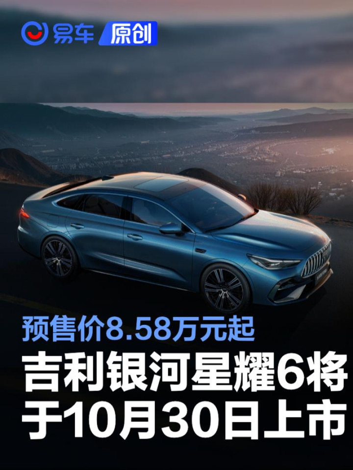 易车讯今日,吉利银河新能源官宣,星耀6将于10月30日上市。新车共推出5款车型,预售价区间8.58-11.28万元。星耀6是吉利银河旗下全新电混轿车,搭载新一代雷神AI电混2.0技术,配备17kWh电池包,纯电续航里程125公里。